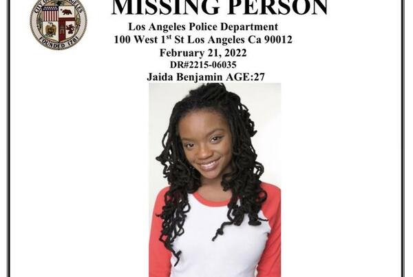 Police Searching For 'Family Reunion' Actress Jaida Benjamin Filed Under: Jaida Benjamin, missing, Studio City. LOS ANGELES (CBSLA) — The Los Angeles Police Department is seeking help locating 27-year-old actress Jaida Benjamin. She was last seen Saturday, Feb 19. at Tujunga Avenue and Ventura Boulevard in Studio City.