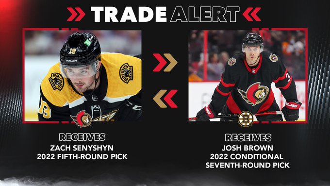 Bruins and Senators make a swap involving Zach Senyshyn ... A pair of Atlantic Division rivals, the Ottawa Senators and Boston Bruins, have hooked up on a trade. The Sens are sending defenseman Josh Brown and a conditional seventh-round draft pick to Boston in exchange for Zach Senyshyn and a fifth-round pick in the 2022 draft.
