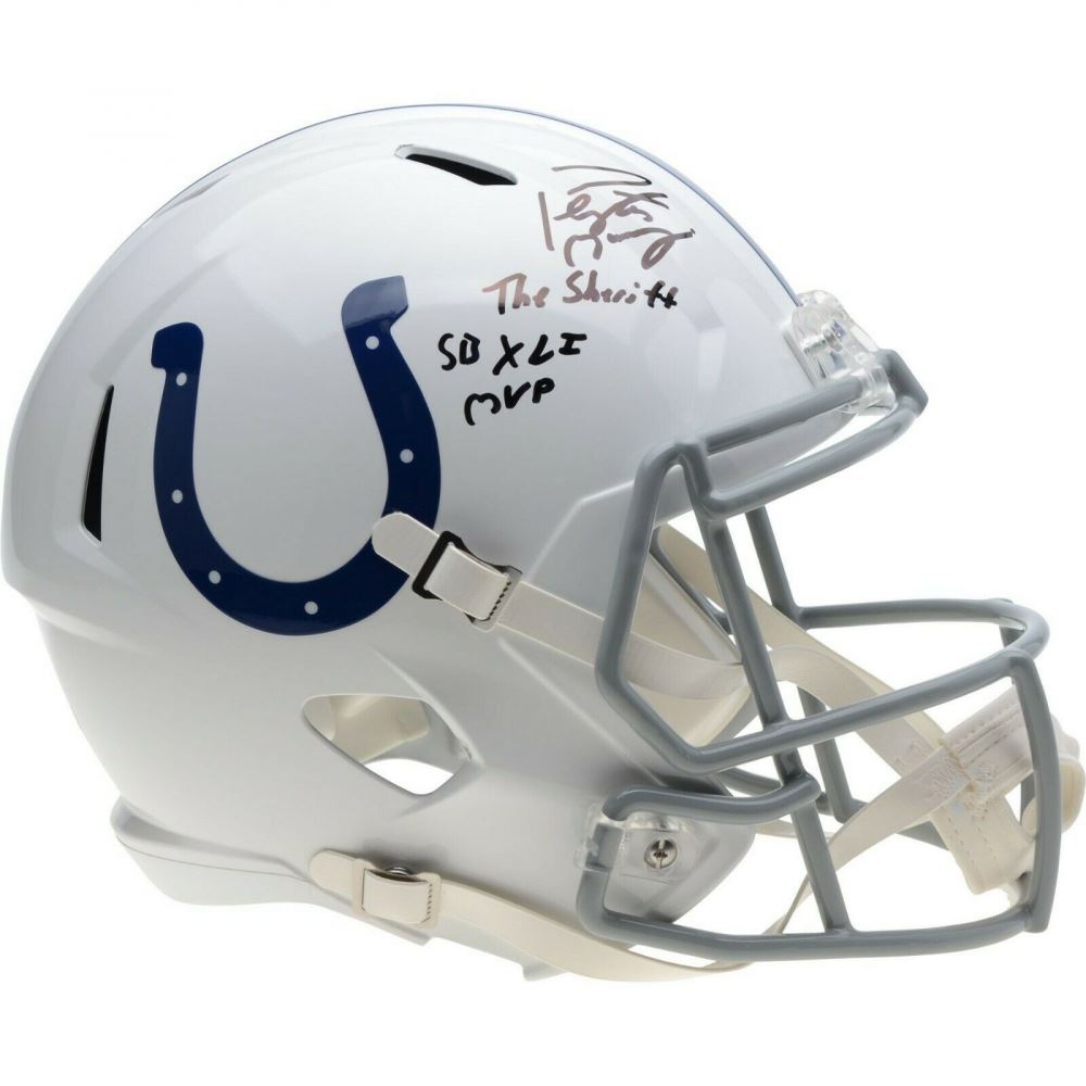 Peyton Manning Signed Colts Full-Size Speed Helmet With ... Buyer's premium $170.00. Total $1,170.00. Bidding Shipping. Share. CLICK TO ENLARGE. Riddell Indianapolis Colts full-size replica speed helmet. Hand-signed by Peyton Manning (HOF). Display case included as shown. The lot / autograph (s) includes an official Fanatics hologram for authenticity purposes.