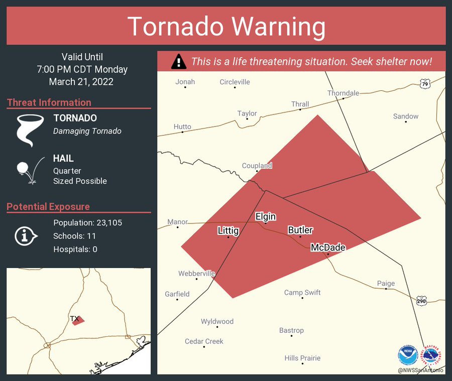 Damage reported from tornadoes in Elgin, Round Rock amid ... Texas authorities said they were responding to a possible tornado north of Austin on March 21, as widespread severe weather impacted the region.The National Weather Service issued multiple tornado warnings on Monday, and left a tornado watch in effect through 10 pm for the Austin area.Police in Round Rock, located north of Austin, said that ...